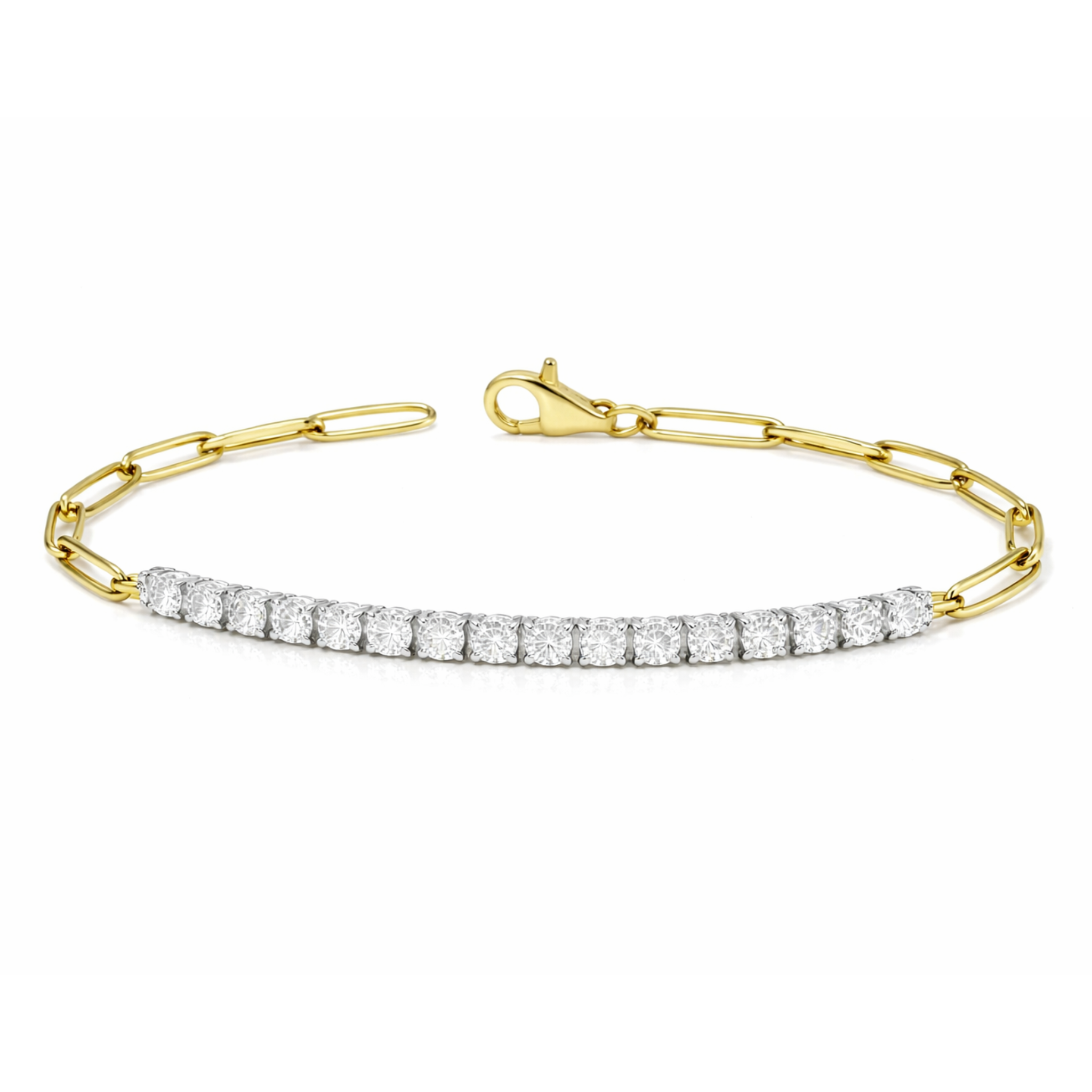 Where modern minimalism meets timeless luxury. This unique bracelet blends the clean geometry of elongated paperclip links with the brilliance of a classic diamond tennis line, creating a striking contrast that feels both fresh and iconic. The two-tone gold design — 14K yellow gold links paired with white gold prong settings — highlights the individuality of each diamond while offering effortless versatility.