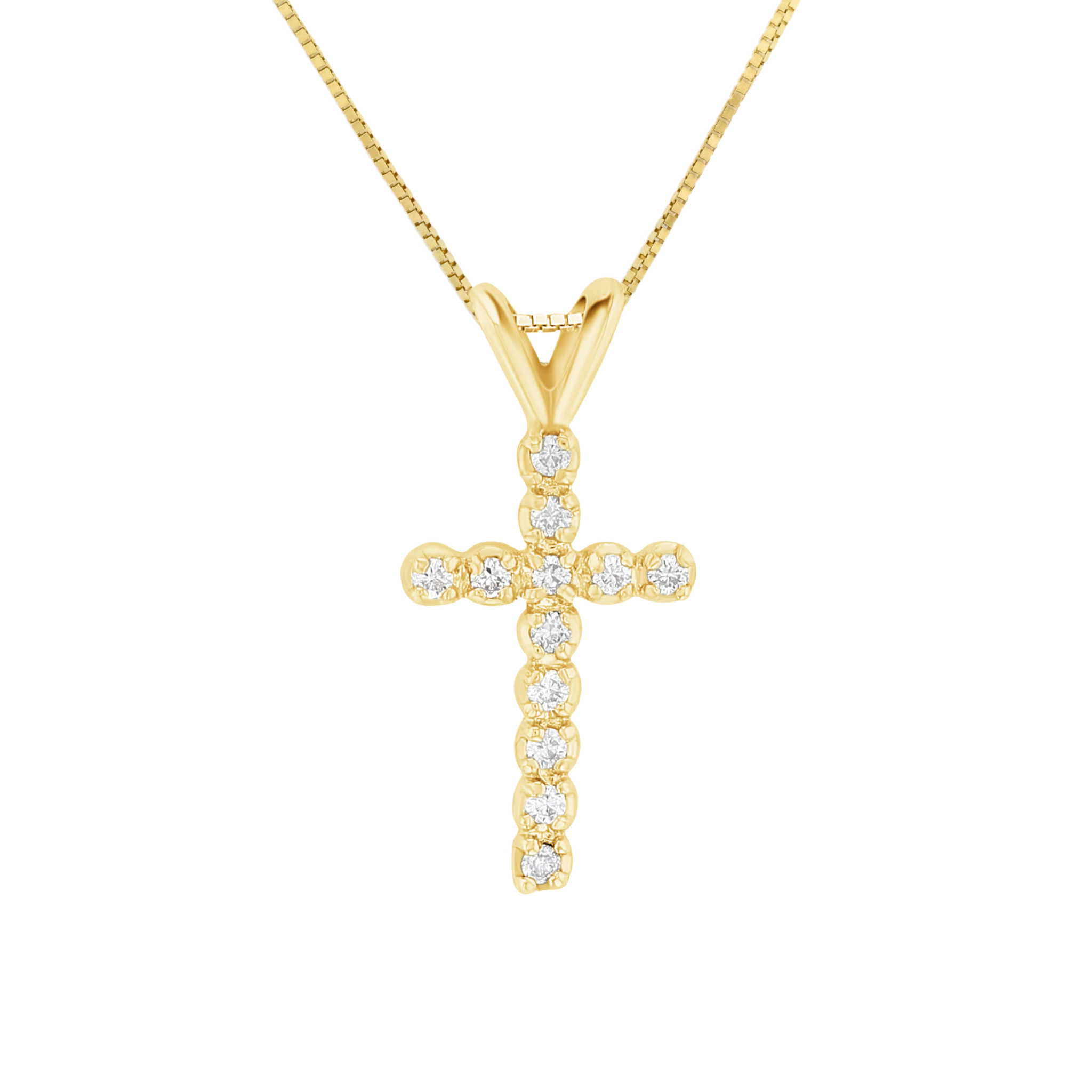 A unique twist on a classic women's diamond cross pendant necklace. This design features 12 floating brilliant round natural diamonds delicately set in a 14k yellow gold cross and 18-inch box chain. Total carat weight of the 12 diamonds is 0.12 ct. tw.
