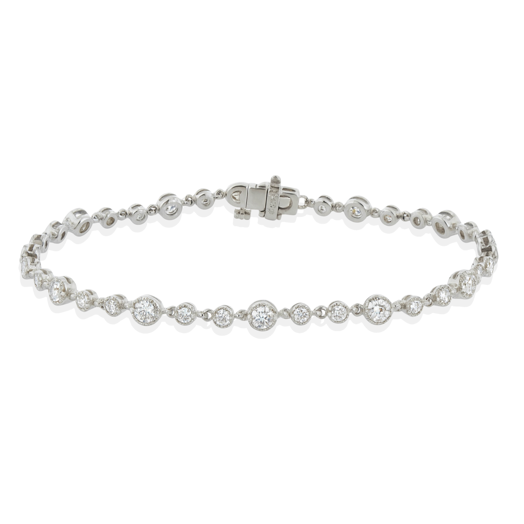 A slight twist on the classic diamond tennis bracelet look. This bracelet design features alternating sized brilliant round diamonds (1 larger, 2 smaller) to create an elegant eye-catching design on your wrist. Each gemstone is placed in a milgrain detailed 14k white gold setting. There are 36 diamonds in total, with a total carat weight of 1.80.