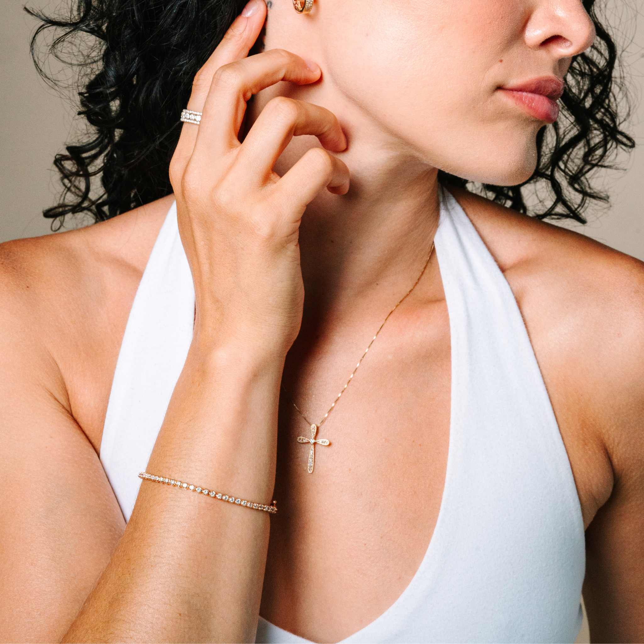 Crafted in 14K gold and set with hand-selected natural diamonds, this petite diamond tennis bracelet embodies timeless elegance with a modern edge. Each stone is tightly framed for a sleek, uninterrupted line of brilliance that catches the light from every angle. Finished with a secure double-latch closure, it’s a classic you’ll wear daily—and treasure for a lifetime.