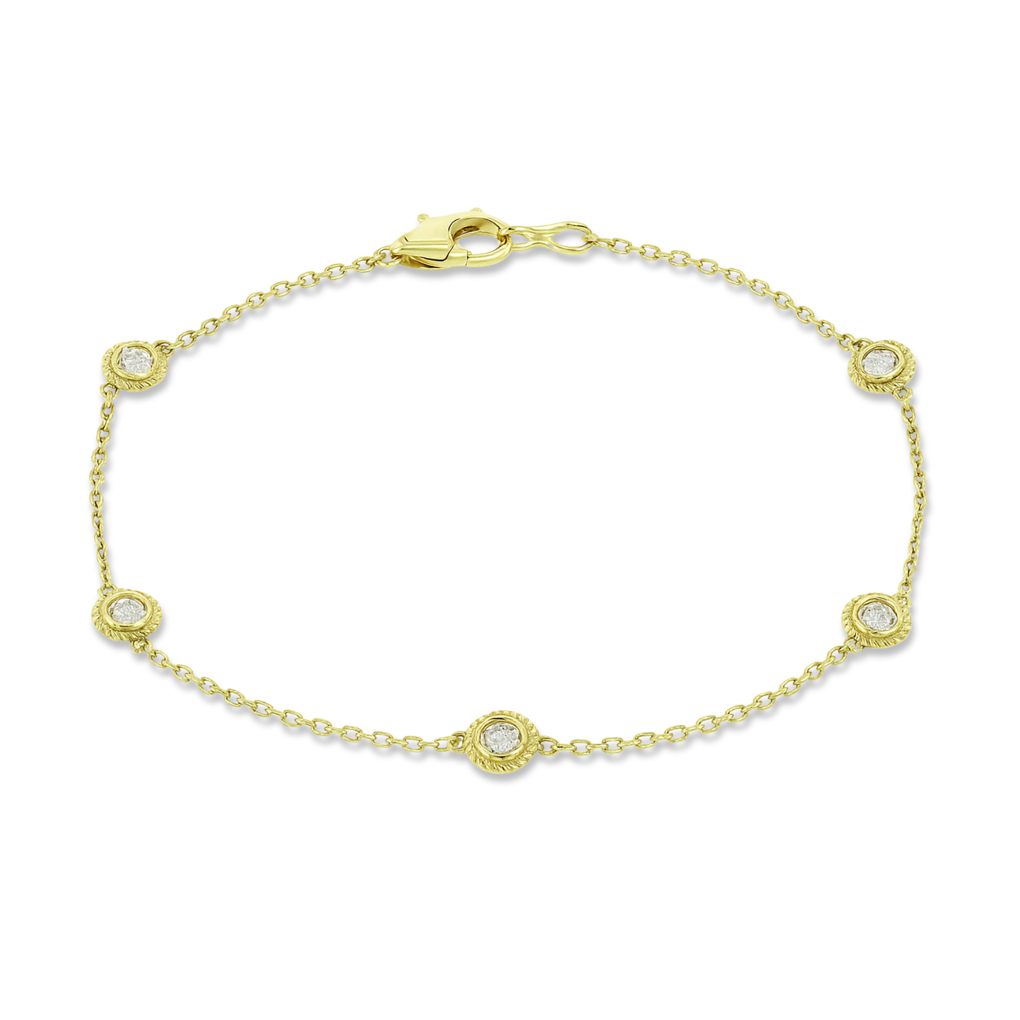 If you're looking for a unique diamond bracelet design, this is the style for you! Our diamonds by the yard bracelet features 5 bezel set natural round diamonds at 0.35 total carat weight stationed along a 14k yellow gold cable chain. The bezel set diamonds also feature milgrain detailing, and the diamond bracelet is finished with a secure lobster claw clasp.