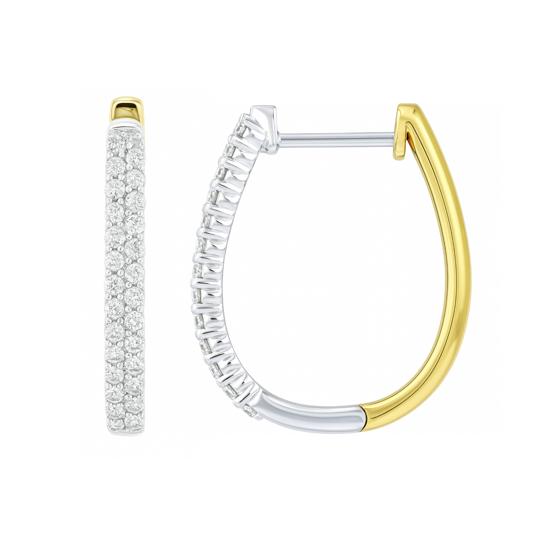 These two-tone, 14k white and yellow gold, diamond hoop earrings feature two rows of brilliant round diamonds at 3/8 total carat weight for that extra head-turning sparkle. A slight tear drop shape adds to the distinct nature of this diamond hoop design and finished with a secure lever clasp.