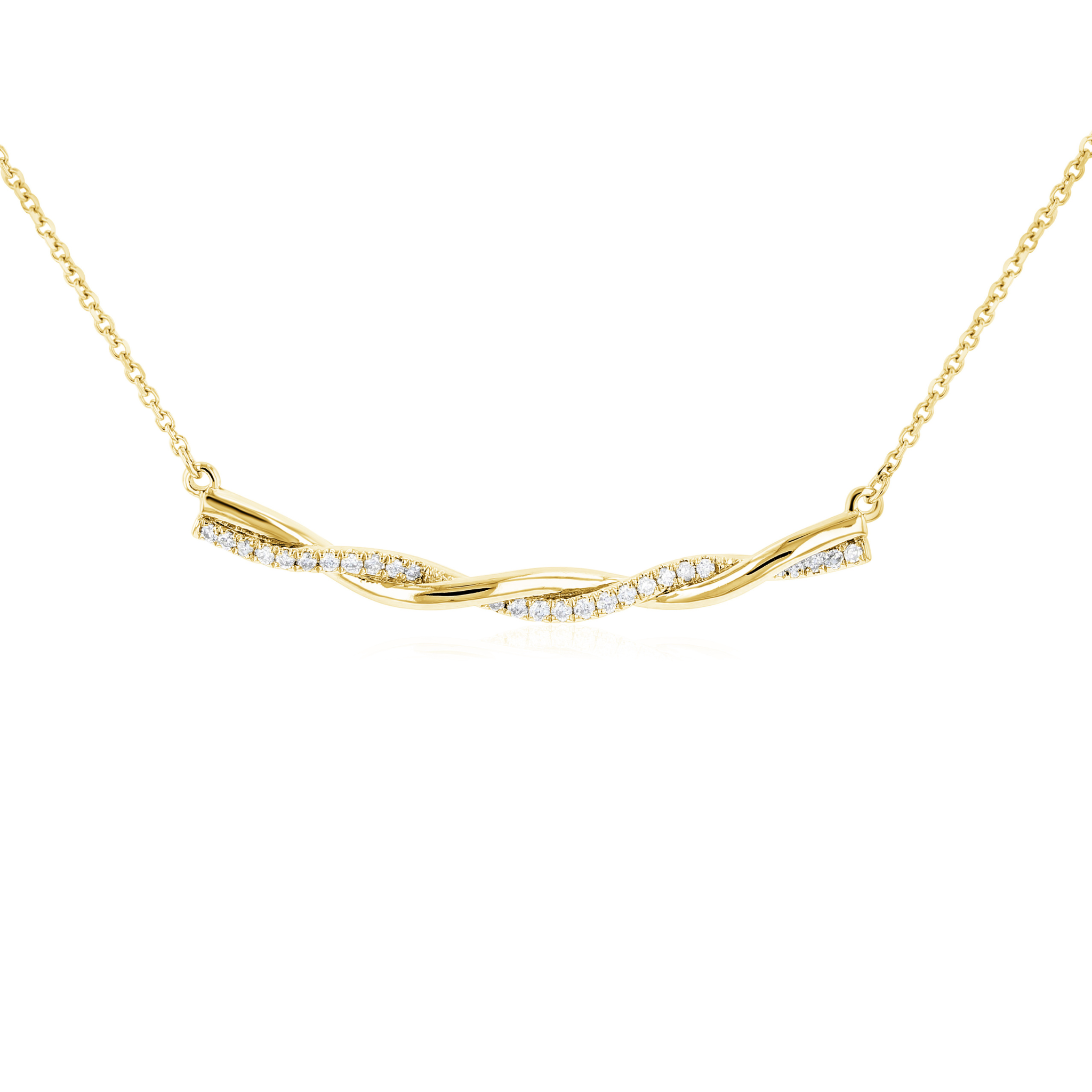 Uniquely stunning twisting curved bar diamond pendant necklace for women. Features 26 brilliant round diamonds at .13 total carat weight, delicately set in 14k yellow gold curved bar twist pendant and finished with an 18-inch cable chain.